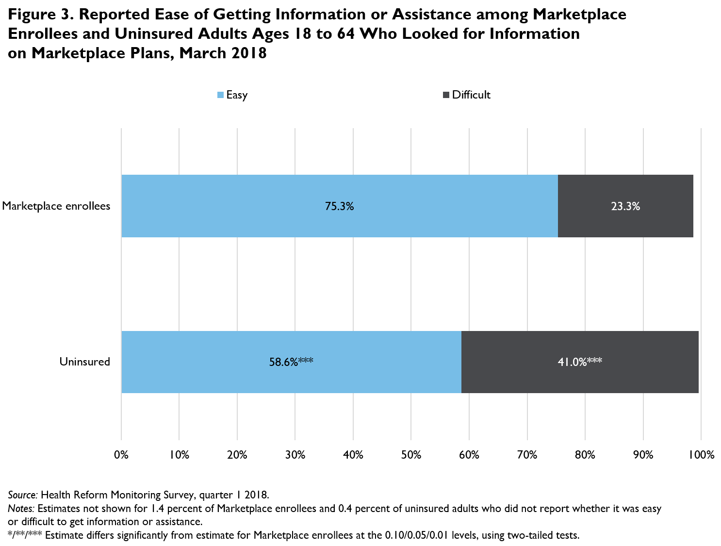 Three-quarters (75.3 percent) of adults who were enrolled in Marketplace coverage in March 2018 reported that it was easy to get information on plans or to get help enrolling in coverage the last time they looked for information or assistance. Meanwhile, among those who looked for information but remained uninsured as of the March 2018 survey, a smaller share (58.6 percent) found these tasks easy (figure 3).