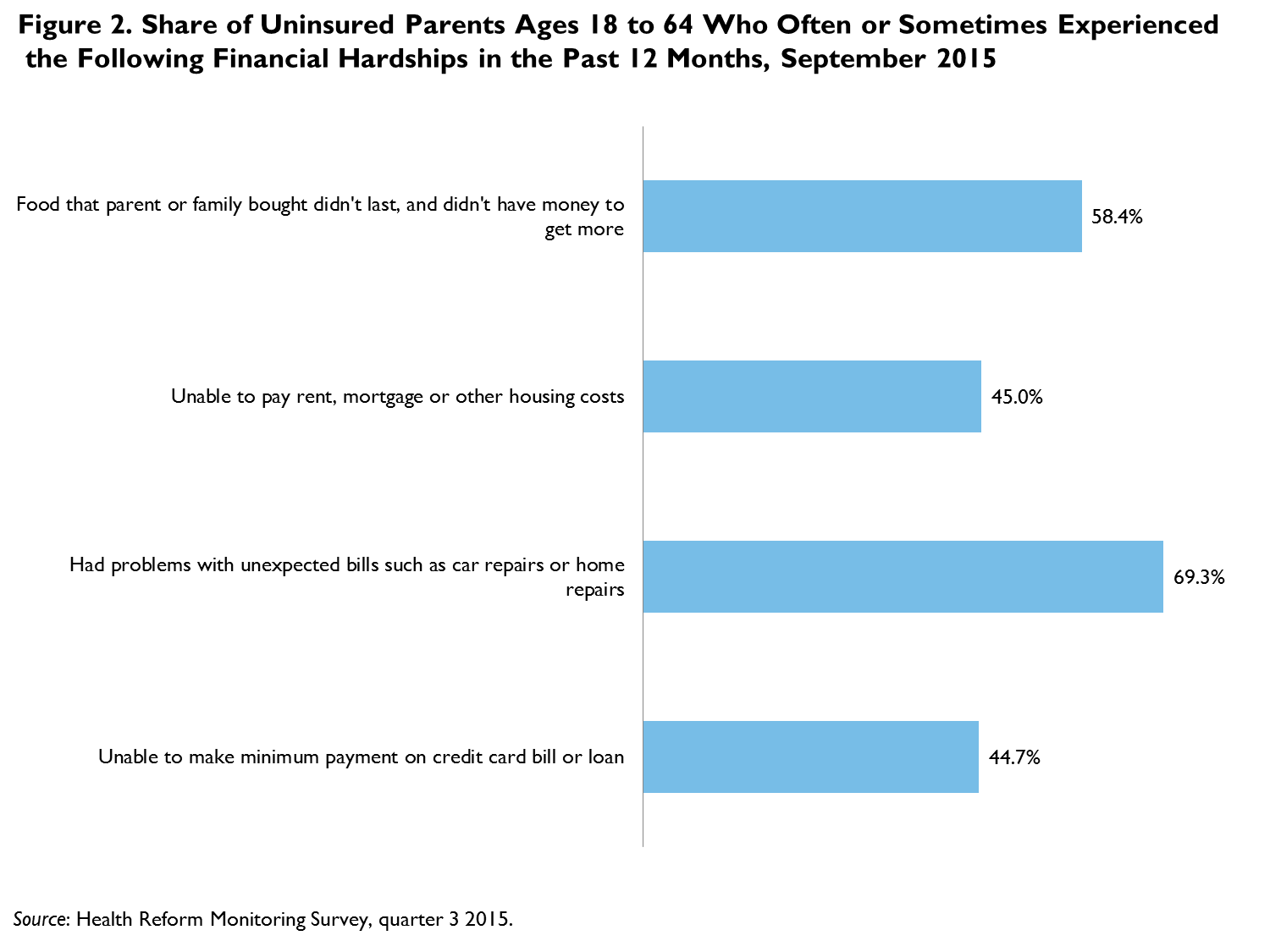 Uninsured parents also report experiencing significant financial hardship and difficulty meeting basic needs in the previous year, and these hardships may help explain why they have been unable to purchase coverage. For instance, in September 2015 nearly 6 in 10 uninsured parents (58.4 percent; figure 2) reported that their family often or sometimes ran out of food in the previous 12 months, nearly twice the proportion of insured parents (30.1 percent; data not shown).3 In addition, 45.0 percent of uninsured parents reported that they often or sometimes were unable to pay the rent, mortgage, or other housing costs; 69.3 percent had problems with unexpected bills, such as car repairs or home repairs; and 44.7 percent were unable to make the minimum payment on a credit card bill or loan.