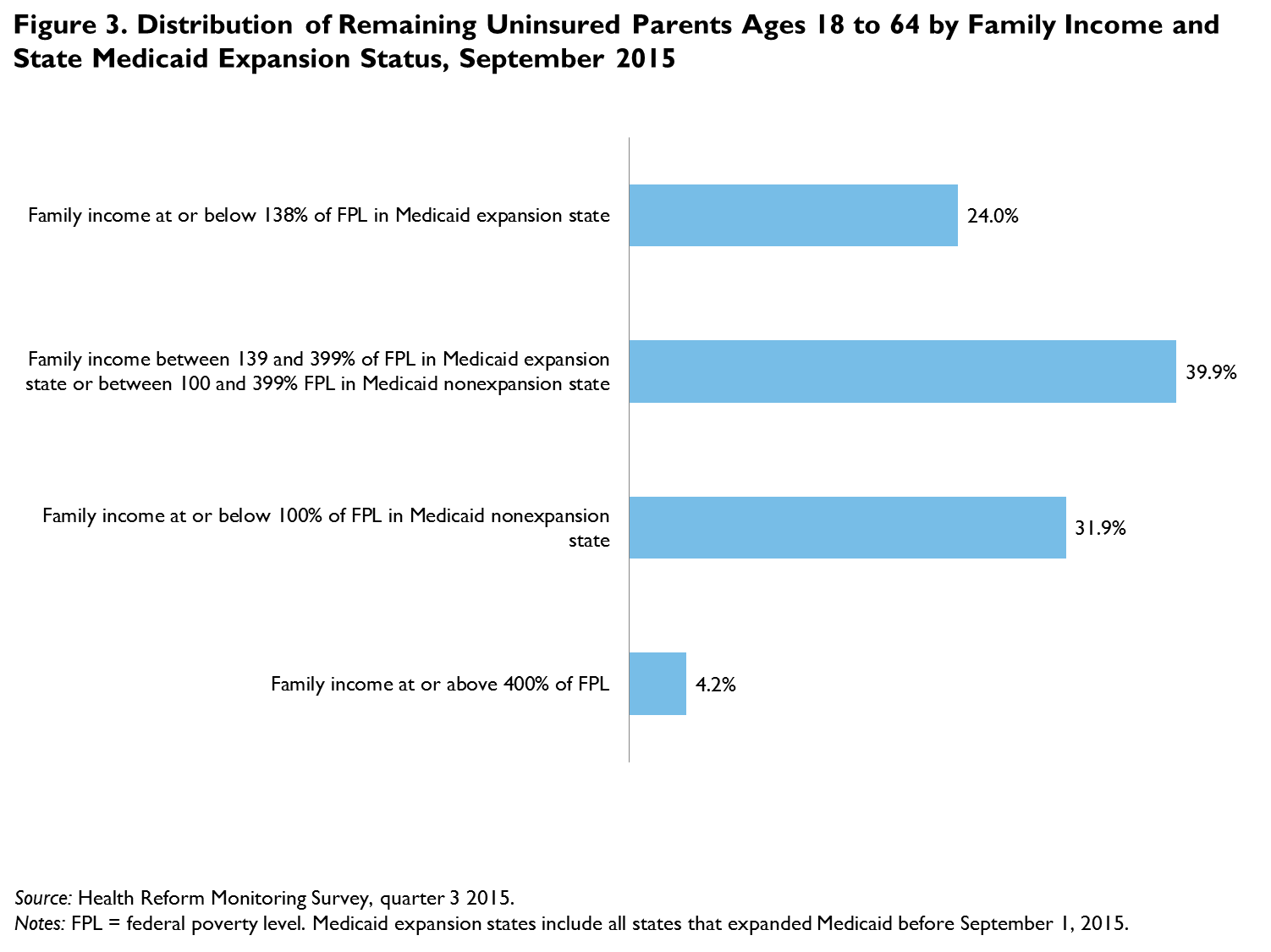 About one-third (31.9 percent; figure 3) of uninsured parents have family incomes at or below the federal poverty level (FPL)4 and live in states that did not expand Medicaid before September 1, 20155—many of these parents are likely in the "assistance gap," having incomes that are too high to qualify for Medicaid but not high enough to qualify for tax credits to purchase coverage in the health insurance Marketplaces.6 Another quarter of uninsured parents (24.0 percent) have incomes at or below 138 percent of FPL and live in Medicaid expansion states.7 Some of these parents may be eligible for Medicaid, though others may be ineligible because of their immigration or documentation status.