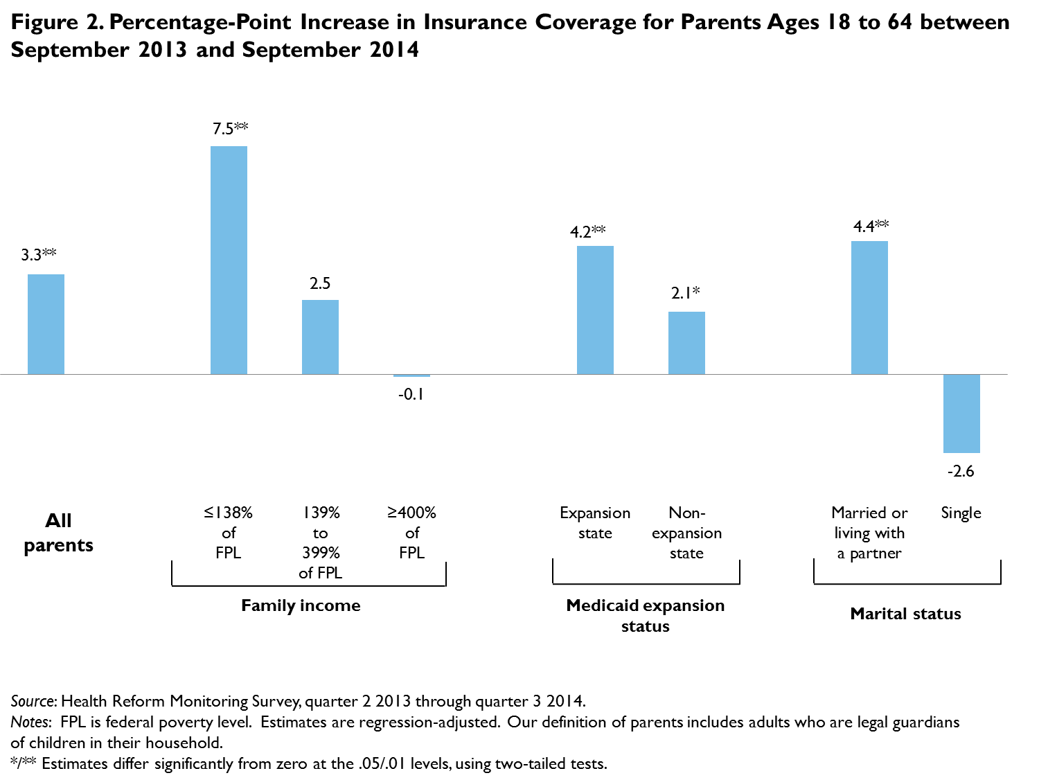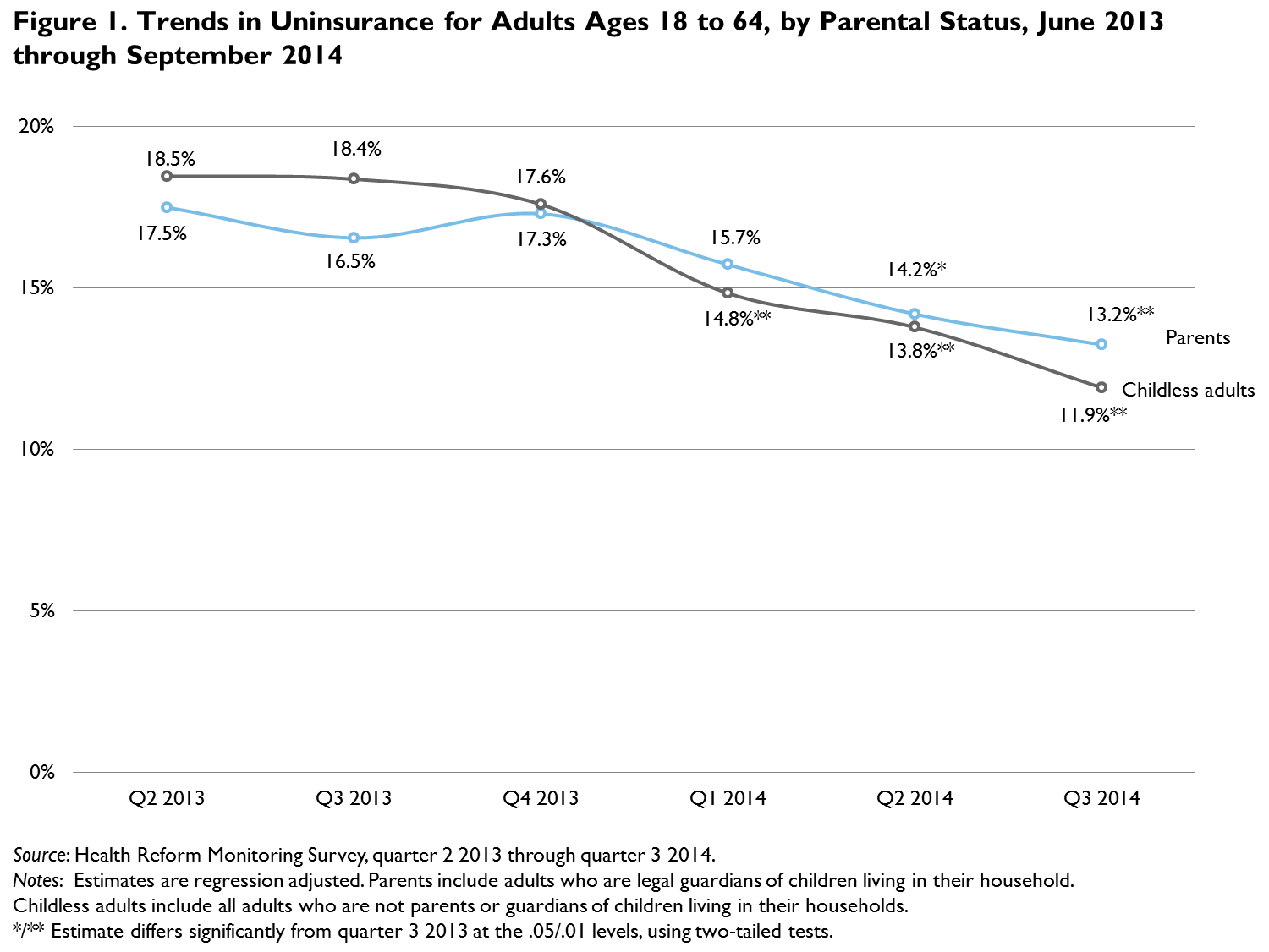 Between September 2013 and September 2014, the uninsurance rate fell 20.0 percent for parents, as compared with 35.2 percent for childless adults.