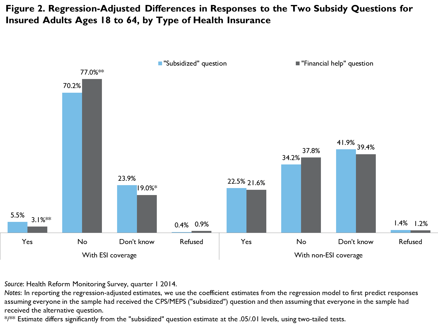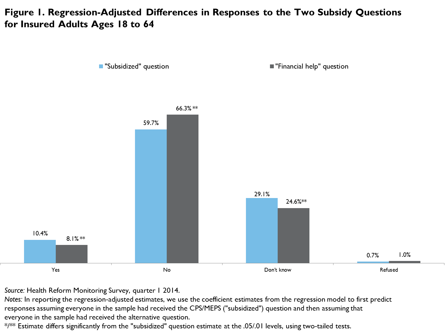The Affordable Care Act (ACA) is significantly changing the share of nonelderly adults who are obtaining subsidized health insurance coverage, both through the Medicaid expansion and through qualified health plans in the new health insurance Marketplace (Centers for Medicare and Medicaid Services 2015; Office of the Assistant Secretary for Planning and Evaluation 2015). Accurately measuring enrollment in these new subsidized coverage options is critical for assessing these new programs. Although administrative data can provide data on enrollment, survey data can provide an in-depth understanding of the characteristics and circumstances of enrollees. But asking about participation in subsidized coverage through household surveys is challenging because of the complexity of our system of public and private coverage, in turn making it difficult for researchers to design effective survey questions and difficult for survey respondents to answer those questions. Those issues are likely amplified by the increasing complexity of both the health insurance system and the complexity of the process for determining subsidies, as well as confusing subsidy terminology. In the March 2014 Health Reform Monitoring Survey (HRMS), we tested two alternative survey questions in a randomized experiment to explore how to ask about premium subsidies in a household survey. One question was based on the language used in the Current Population Survey (CPS)/Medical Expenditure Panel Survey (MEPS),1 and an alternative question was based on wording proposed by an expert panel: