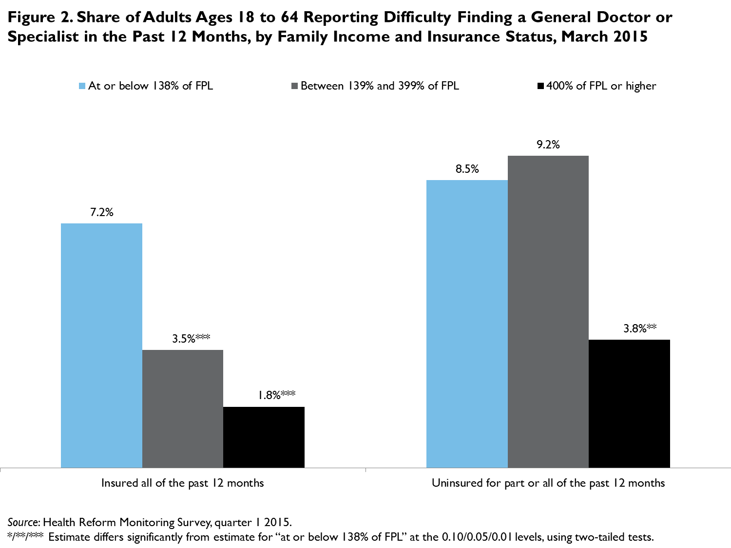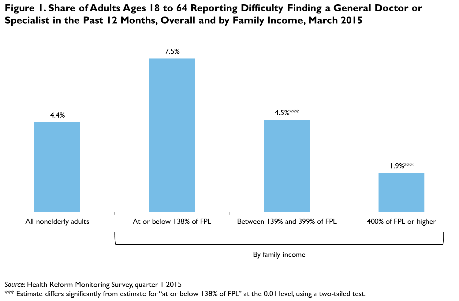 As of March 2015, 4.4 percent of nonelderly adults reported difficulty finding a general doctor or specialist in the past 12 months. Low-income adults in were nearly four times as likely as higher-income adults to report difficulty finding a general doctor or specialist (7.5 percent and 1.9 percent, respectively; figure 1).
