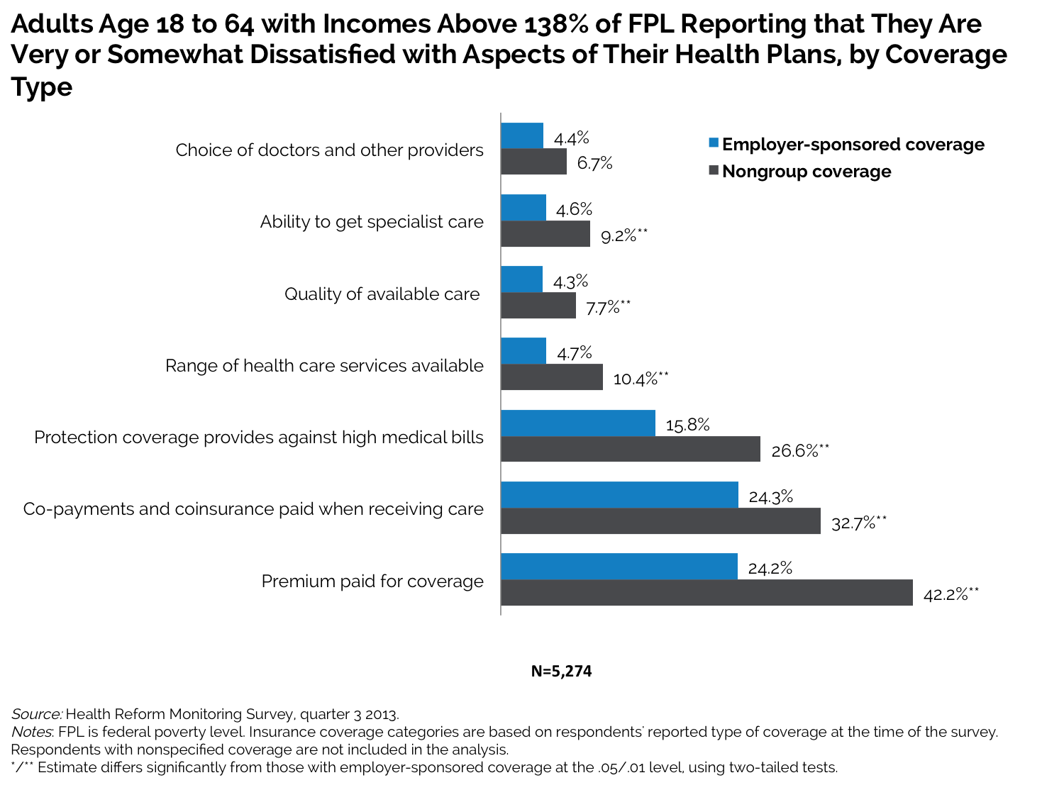Dissatisfaction was especially high in the nongroup market for cost-related aspects of health plans, including premiums paid (42.2 percent), co-payments and coinsurance (32.7 percent), and protection against high medical bills (26.6 percent).