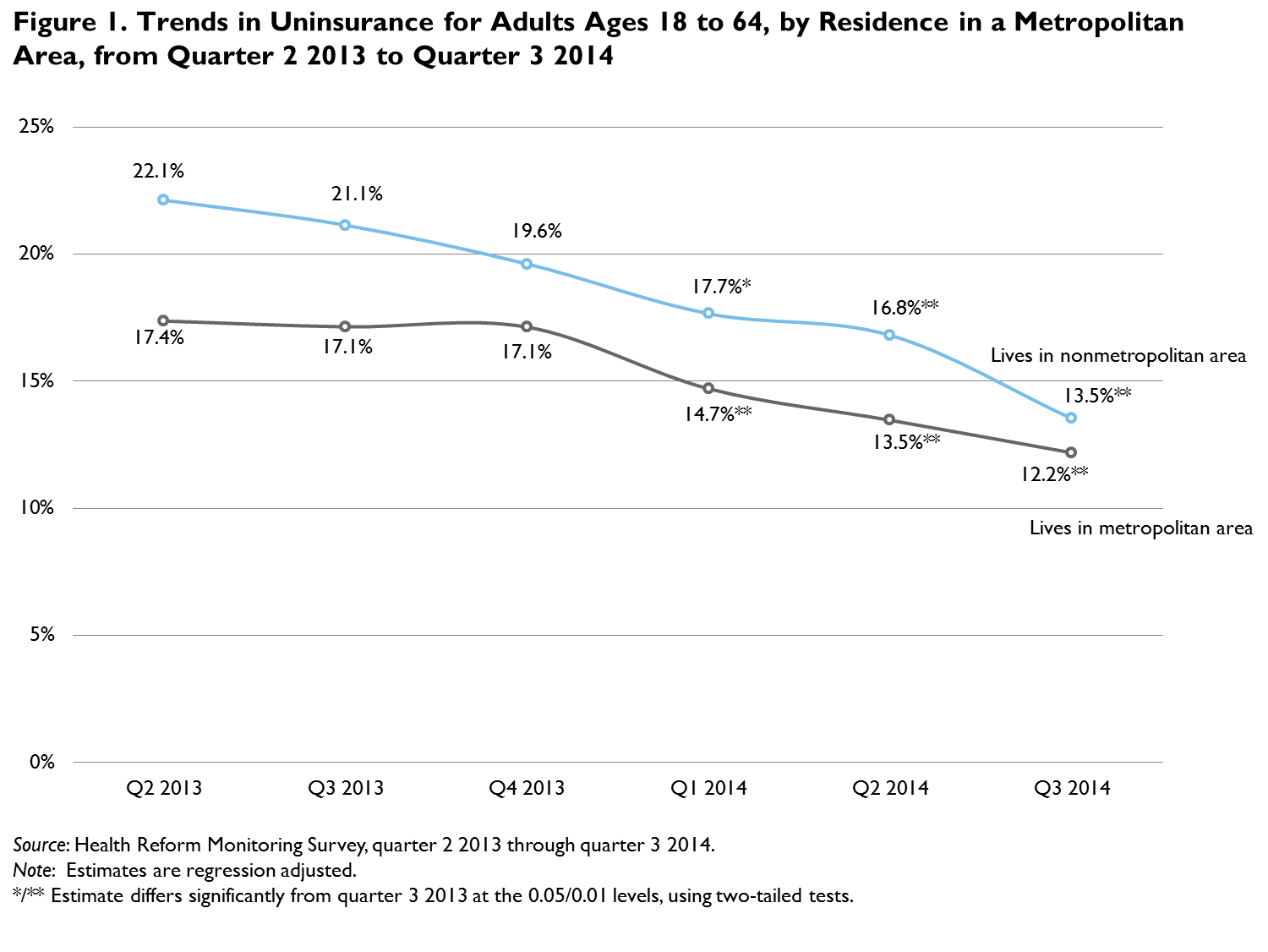 Methods: Each round of the HRMS is weighted to be nationally representative. We use these weights and a regression adjustment to control for differences in the demographic and socioeconomic characteristics of the respondents across the different rounds of the survey. This allows us to remove any variation in insurance coverage caused by changes in the types of people responding to the survey over time rather than by changes in the health insurance landscape. The basic patterns shown for the regression-adjusted measures are similar to those based solely on simple weighted estimates. In presenting the regression-adjusted estimates, we use the predicted rate of each coverage type in each quarter for the same nationally representative population. For this analysis, we base the nationally representative sample on survey respondents from the most recent 12-month period from the HRMS (i.e., quarter 4 of 2013 and quarters 1–3 of 2014). We focus on statistically significant changes in insurance coverage over time (defined as differences that are significantly different from zero at the 5 percent level or lower) and highlight changes relative to September 2013, just before the open enrollment period for the Marketplaces began. We provide a 95 percent confidence interval for key estimates.