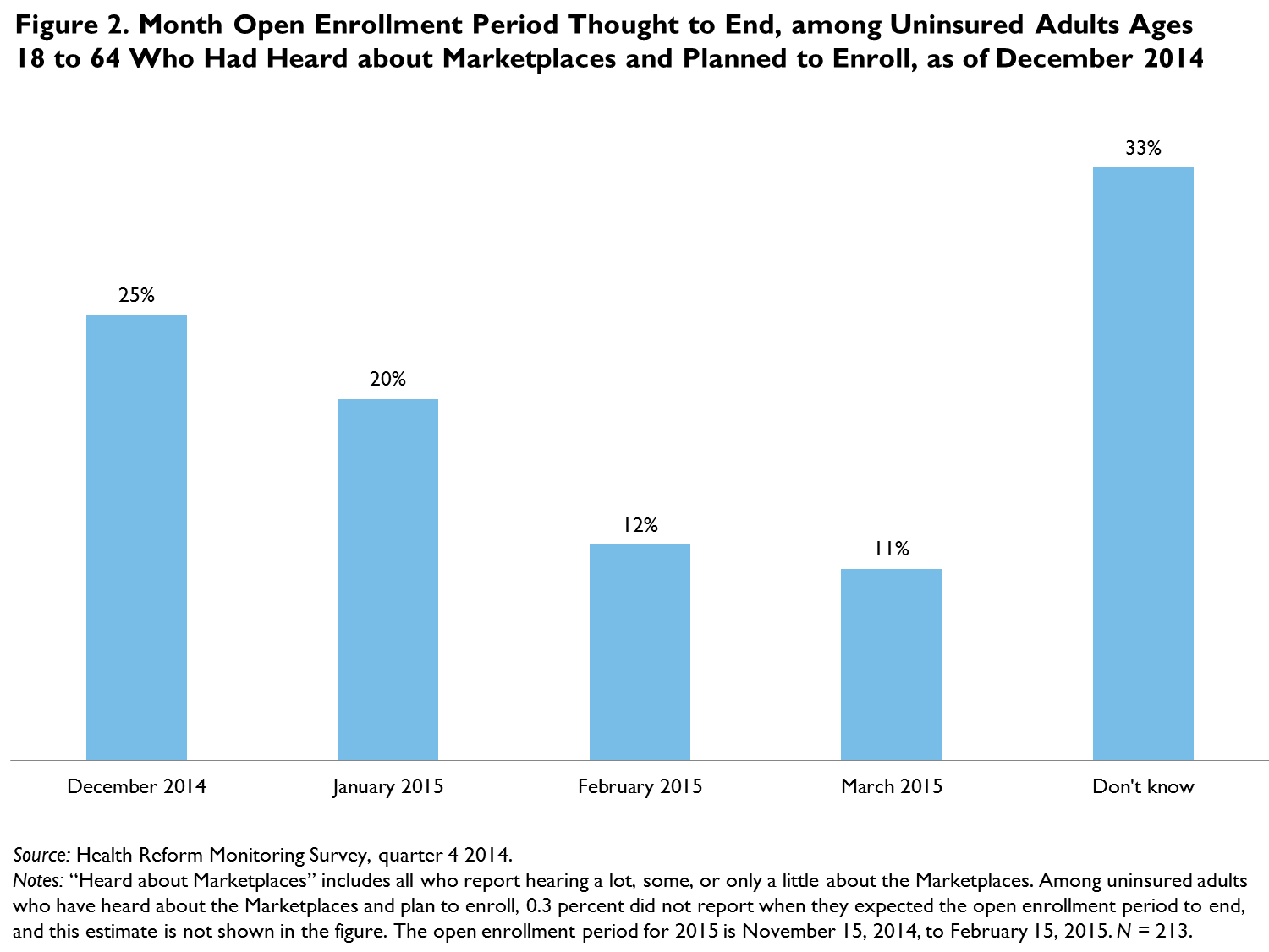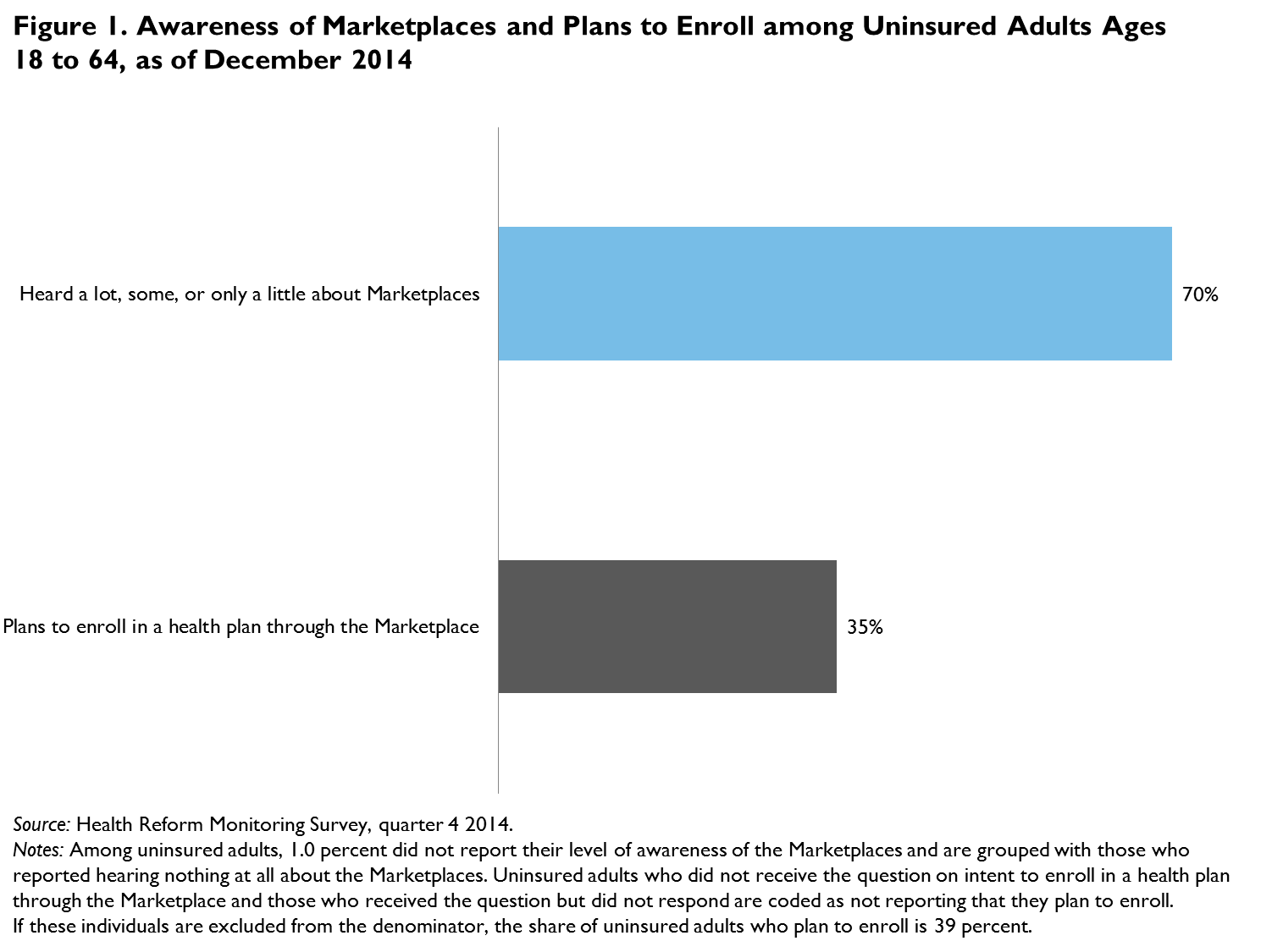 Although many uninsured adults were aware of the Marketplaces and planned to enroll in a health plan as of December, the findings presented here show that there are still many who need to learn more about the Marketplaces. Even among those interested in enrolling, we find sufficient confusion about when open enrollment ends that many may miss the opportunity to purchase coverage for 2015.