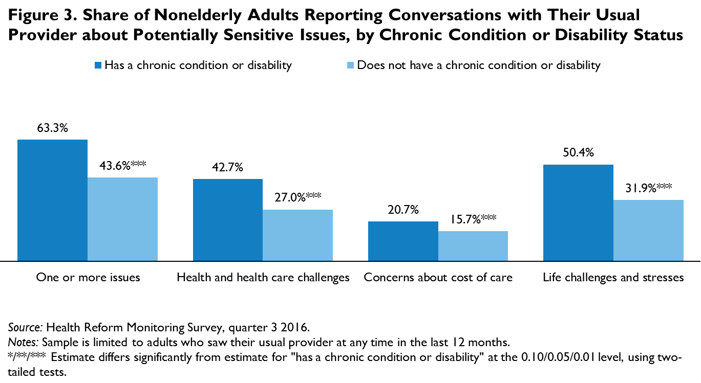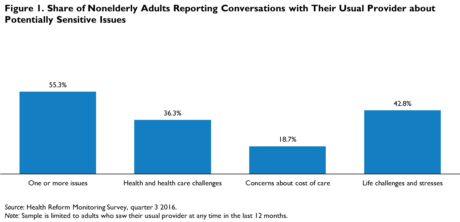 Patient-centered models of health care, such as shared decisionmaking and medical homes, encourage patients to talk to their providers about issues that may affect their care, from treatment plans and costs to the day-to-day challenges that make maintaining health difficult.1 Existing surveys ask respondents whether they talked with their provider about health questions or concerns, but provide limited detail and cannot classify responses by key respondent characteristics. In this QuickTake, we use data from the September 2016 Health Reform Monitoring Survey (HRMS)2 to explore how often patients have conversations with their providers about the following potentially sensitive issues: