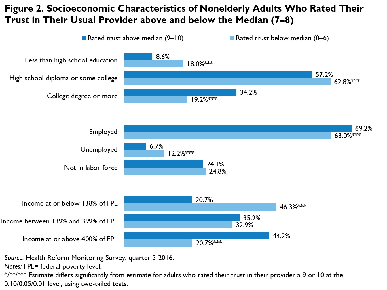 Adults who gave trust ratings below the median category of 7–8 were more likely to be young and Hispanic or nonwhite, compared with adults who gave ratings above the median (figure 1). Those who rated their trust in their provider below the median also tended to have fewer economic resources: adults who gave ratings below the median were more than twice as likely to have family incomes at or below 138 percent of the federal poverty level (FPL) as those who gave ratings above the median (46.3 percent versus 20.7 percent; figure 2). Consistent with this income difference, adults who gave trust ratings below the median were less likely to have a college education and more likely to be unemployed.