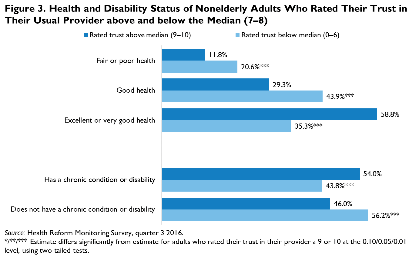 Adults who gave ratings above the median and adults who gave ratings below the median also differed by the presence of health problems (figure 3). Adults who reported above-median trust in their provider were more likely to say their health was very good or excellent than those who reported lower trust (58.8 percent versus 35.3 percent). Those reporting higher trust were also more likely to have a chronic condition or disability; this may reflect the higher stakes of the patient-provider relationship for adults with health problems, as well as their more frequent interactions with their providers.